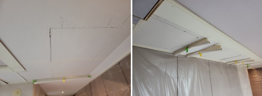 배관과 드레인 작업을 위해 천장에 중요한 작업이 진행됩니다. 이 때, 천장 도배지를 완전히 잘라내는 대신, 정교하게 세 면을 조심스럽게 제거하고 작업이 끝난 후에 그대로 복원하는 방식을 채택합니다.