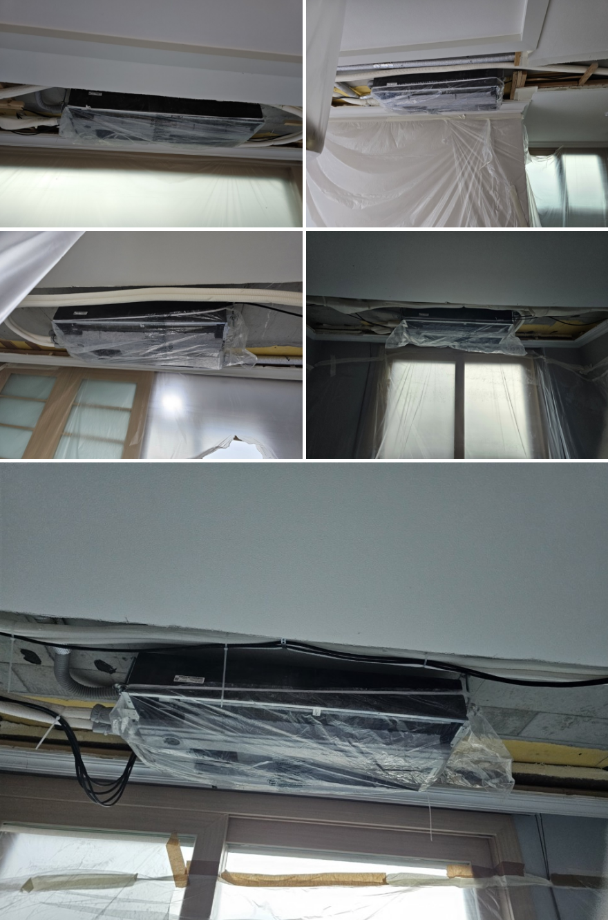 현재 저희가 작업한 세대는 천장 전체에 단내림 시공 방법을 적용하였습니다. LG프리미엄 시스템 에어컨(신형)을 총 6대를 설치하는 작업을 3일 동안 진행하여 완료하였습니다. 단내림 시공은 일반적으로 에어컨 입상작업, 단내림, 도배 및 복원 순서로 이루어지며, 보통 3일 정도의 시간이 소요됩니다.