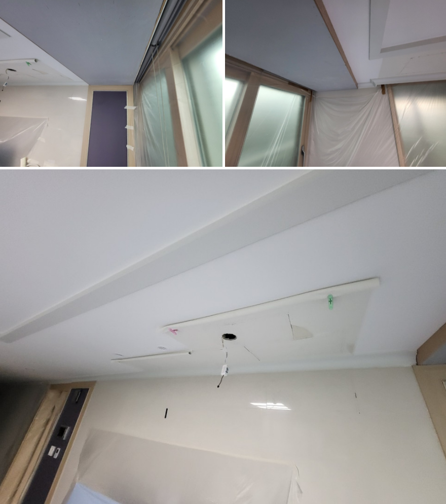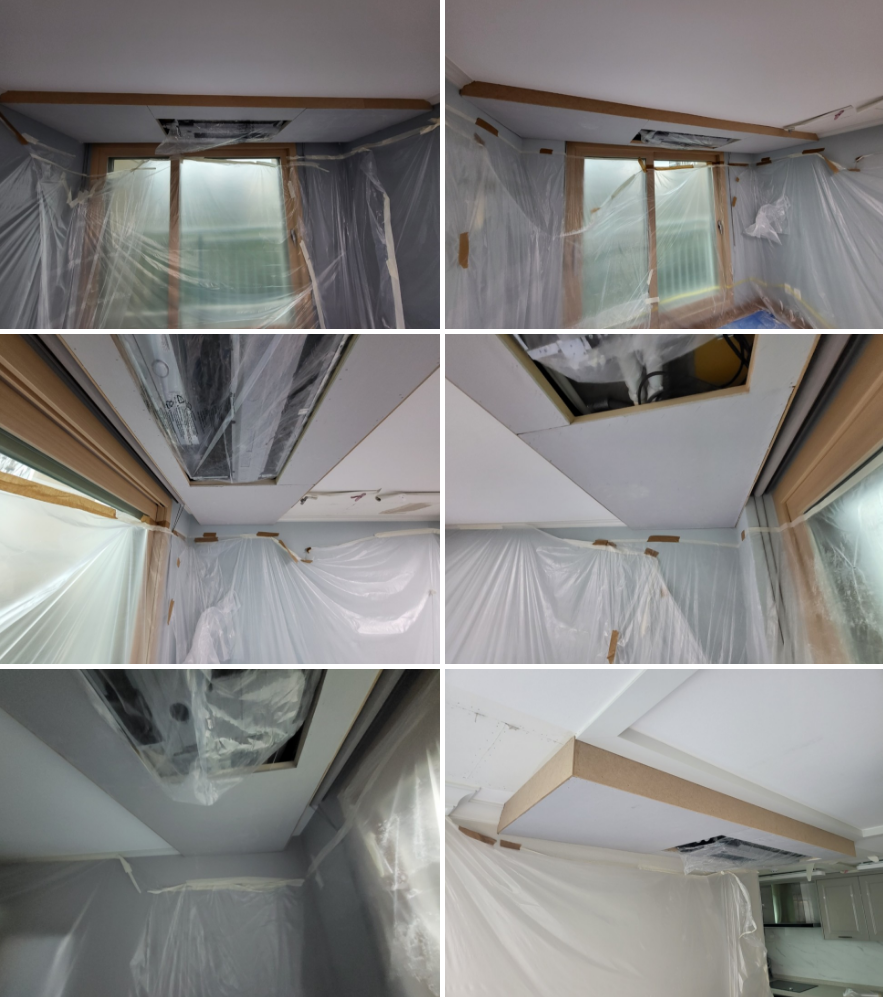 작업은 원활하게 진행되었지만, 특이한 상황이 있었습니다. 동일한 세대 내에서 천장의 높이가 6cm에서 12cm로 다양하게 변동하였으며, 창가 쪽은 이중으로 단열재가 사용되어 있었습니다.