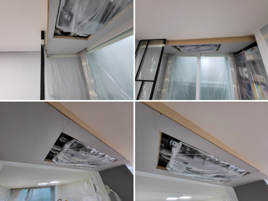 천장을 타공한 모습을 보면 공간이 굉장히 협소해 보일 것입니다. 천장 단내림은 천장 전체를 내리는 것이 아니라, 실내기가 설치되는 부분과 배관이 통과하는 구간에 집중적으로 이루어집니다. 간단히 말씀드리면, 실내기가 설치되는 부분은 우물 모양의 천장이 단이 내려가는 것으로 생각하시면 됩니다. 이렇게 단내림 작업이 진행되면 천장 공간을 활용하여 시스템 에어컨을 설치할 수 있게 됩니다.