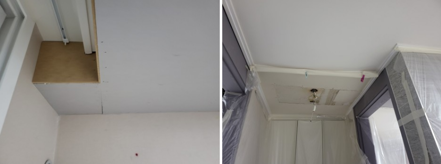 오른쪽 사진을 보시면, 배관 연결을 위한 포인트로 천장 개복을 위해 도배가 벗겨져 있고 한쪽으로 말려있는 것을 확인하실 수 있습니다. 단내림 작업은 실내 천장에 새로운 도배지를 바르는 것이 맞지만, 이러한 작업을 위해 개복을 하고 나서는 원래 있던 도배지를 그대로 활용하는 것이 중요합니다.
