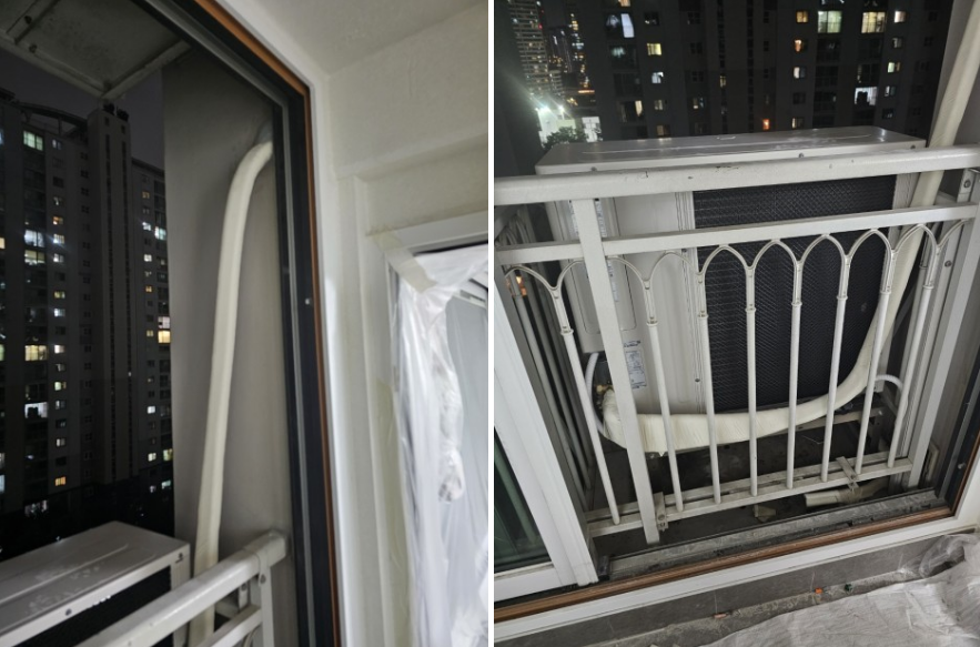 도곡렉슬은 실내에 별도의 실외기 공간이 마련되어 있지는 않고, 베란다 난간에 앵글에 거치하는 방식입니다. 베란다 쪽에서 작업을 하는 경우 철저하게 안전장치를 확인하고 작업을 진행합니다.