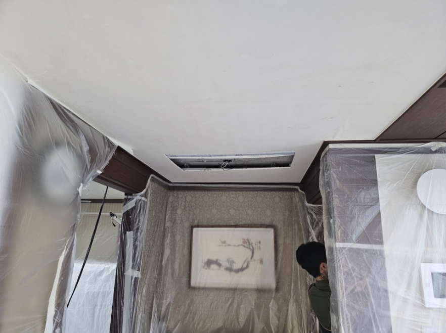 작업 일정이 급박해서 설치과정의 사진을 자세히 찍지 못했지만, 이번 시공 세대에서의 핵심은 천장바닥면의 구조를 정확하게 이해하고, 수평을 완벽하게 조절하여 이후 시스템 에어컨 설치 시 천장에 단이 최소화되어 내려갈 수 있어야 한다는 점입니다.