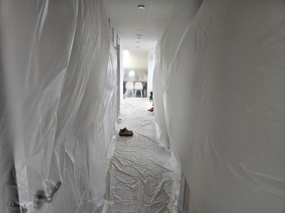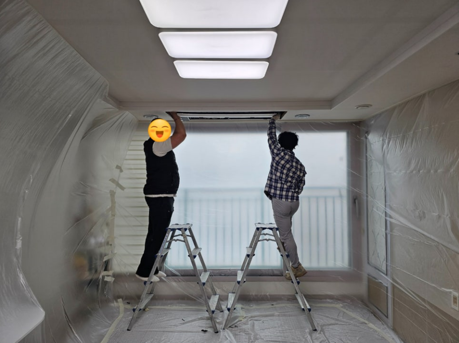 거주 중인 세대에서의 작업이므로, 본격적인 설치 작업에 앞서 꼼꼼한 보양 작업이 필수적입니다. 고객들이 가장 걱정하는 부분도 바로 이 보양 작업입니다. 벽과 천장 타공 과정에서 발생하는 미세한 공사 분진이 생활 공간으로 유입되지 않도록 천장에서 바닥까지 빈틈없이 보양하는 것이 중요합니다.