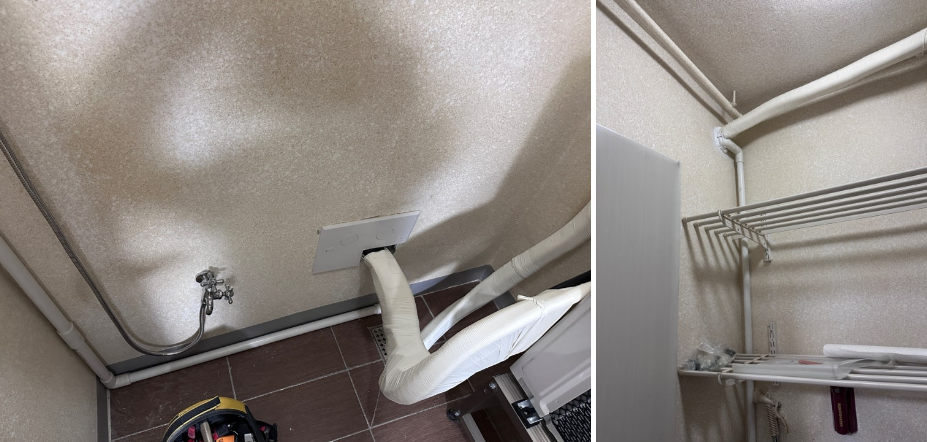 배관도 천장을 따라 실외기실 벽면을 통해 연결할 수 있었습니다. 예전 아파트들은 이런 구조가 없어 입상 작업에 시간이 많이 걸렸지만, 최근에는 시스템 에어컨 설치를 고려해 아파트를 짓는 것이 일반화되었습니다.