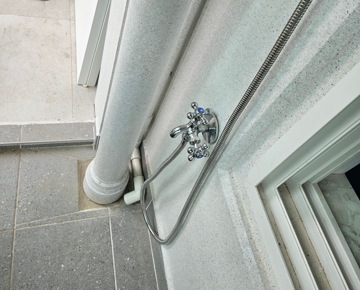 204동 세대 : 실외기 실이 있던 루버를 제거하고 옆으로 빼내어 실외기를 테라스 내부에 위치하도록 했습니다. 실외기 뒷편으로 이동이 용이하도록 실외기 배관 연결에서 동엘보 연결부속을 써서 라운드를 최소화했습니다.