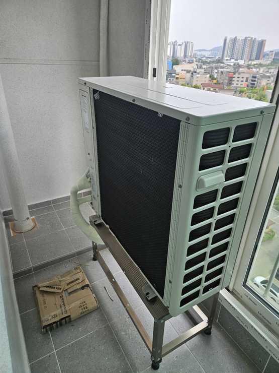 212동 세대 : 실외기가 6마력으로 사이즈가 다소 큰 편이었습니다. 고객께서는 실외기실이 좁아 걱정하셨지만, 뜨거운 바람이 루버창을 통해 바로 나갈 수 있도록 가로로 배치하여 원활한 공기순환을 가능하게 했습니다.