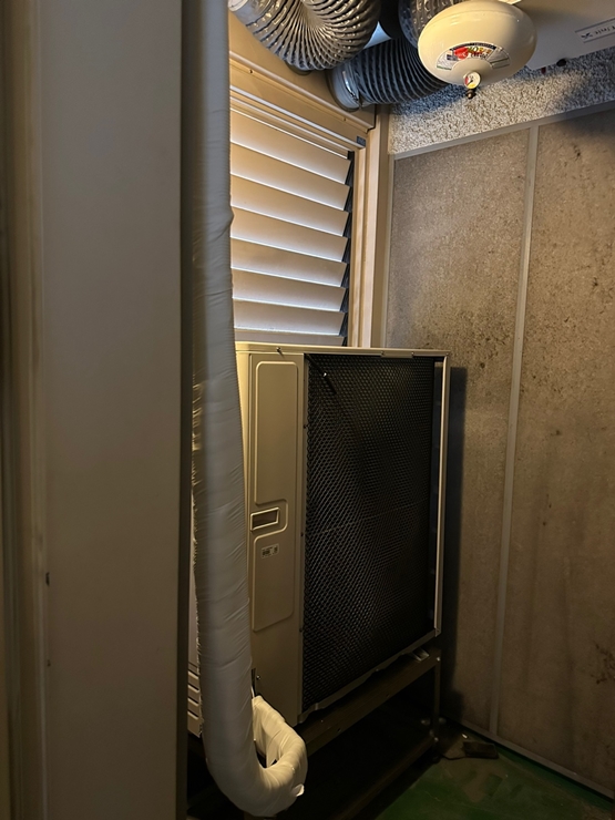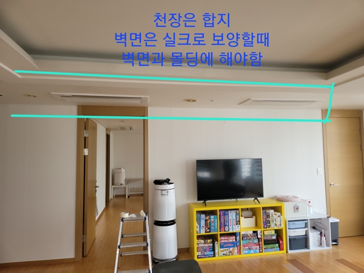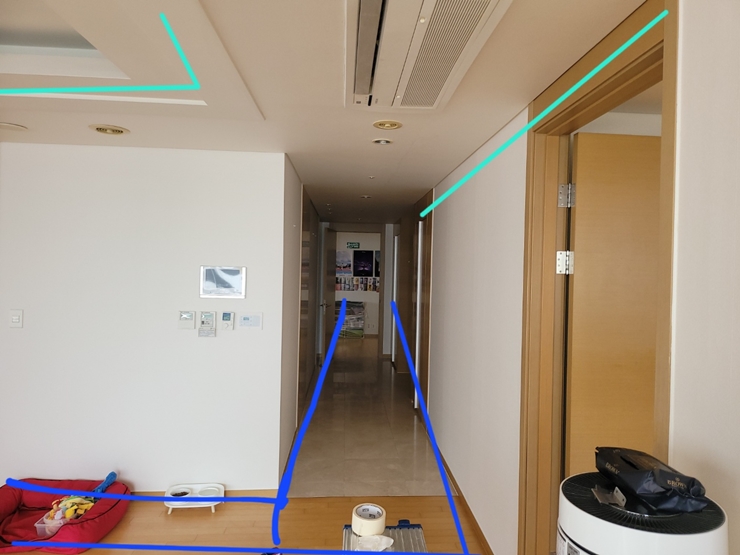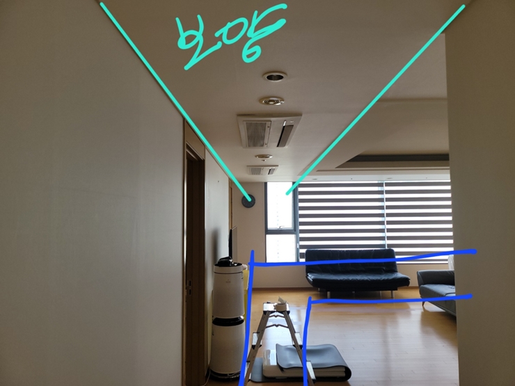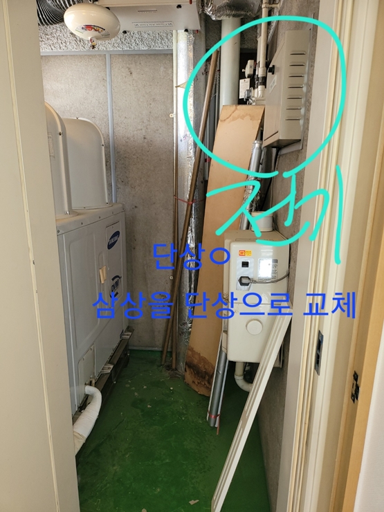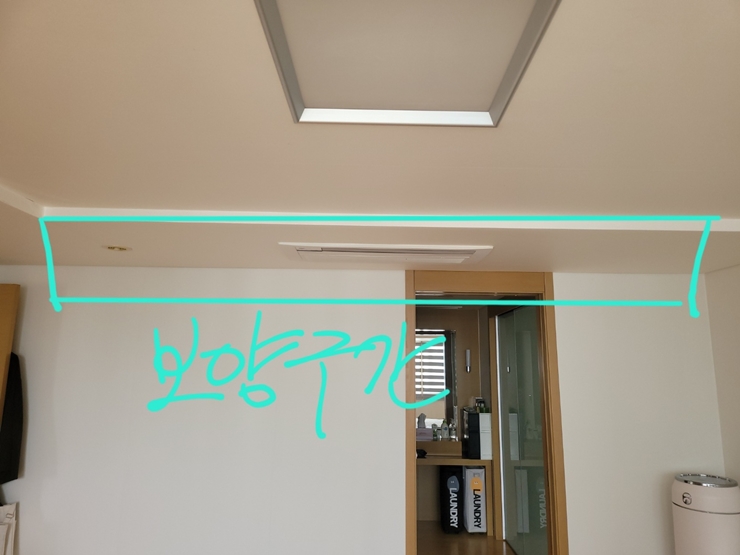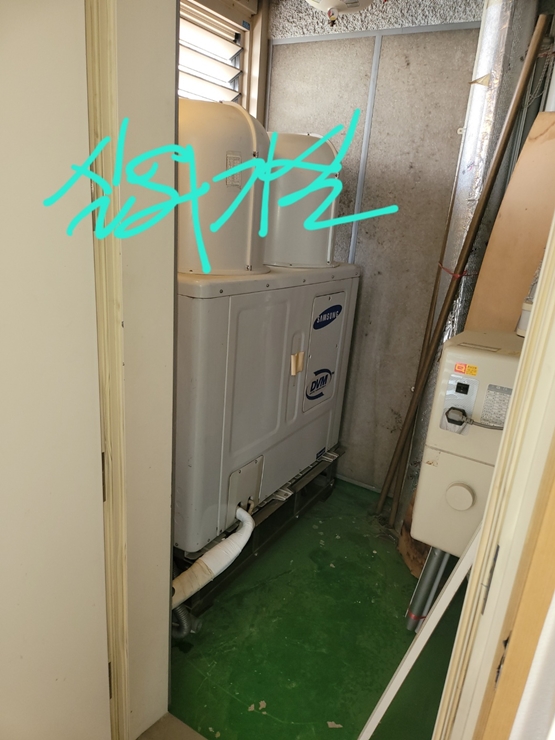 실외기실은 공간도 넓고 환기구도 충분히 잘 되어 있었습니다. 다만 삼상을 단상으로 교체하기로 했습니다. 현재 거주 중인 세대이기에 작업 중 발생하는 먼지가 가구나 가전기기 등에 내려앉지 않도록 더욱 꼼꼼한 보양 작업이 필요합니다. 특히 이 세대는 천장 도배지가 합지로 되어 있어 보양 작업 시 합지를 손상시키지 않도록 철저하게 레이아웃을 구성했습니다.