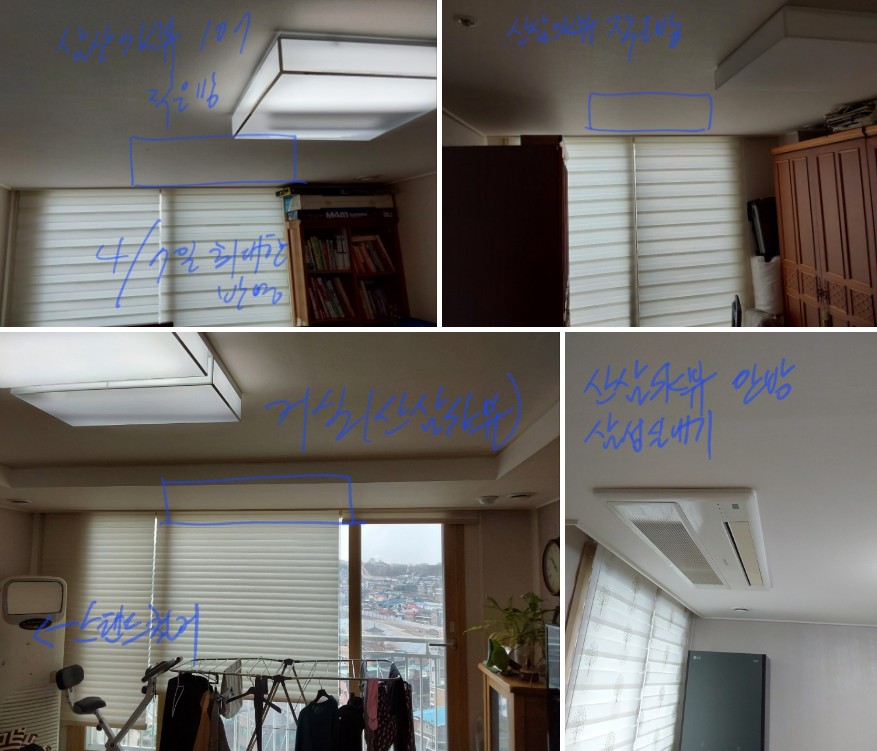 에어컨 설치 후 시험 가동을 하면서 찍은 사진입니다. 거실과 각 방에 자리한 실내기를 최저 온도까지 가동해 이상 유무를 파악했습니다. 봄이라 지금은 사용하지 않겠지만, 여름이 되면 시원한 바람이 나오겠죠.