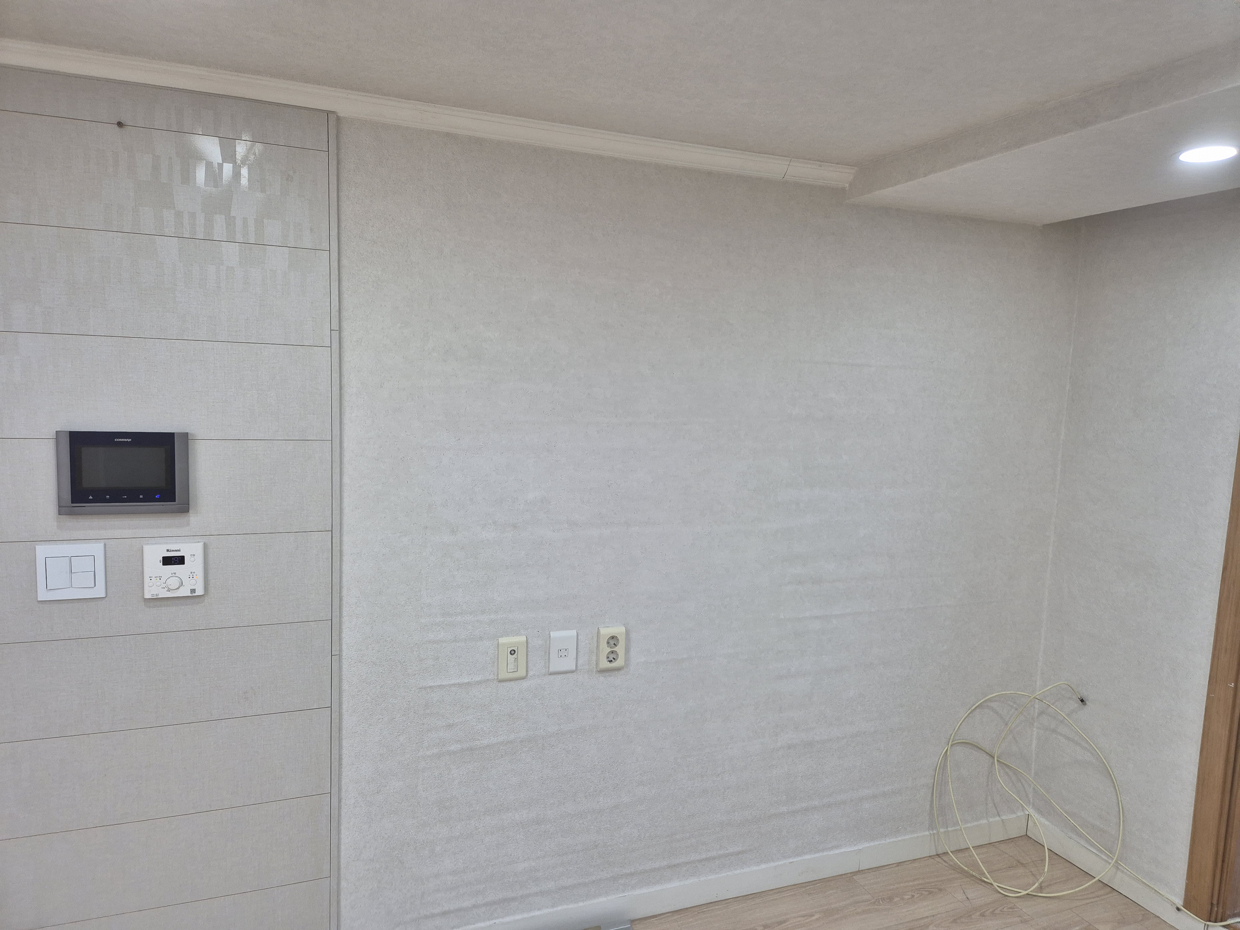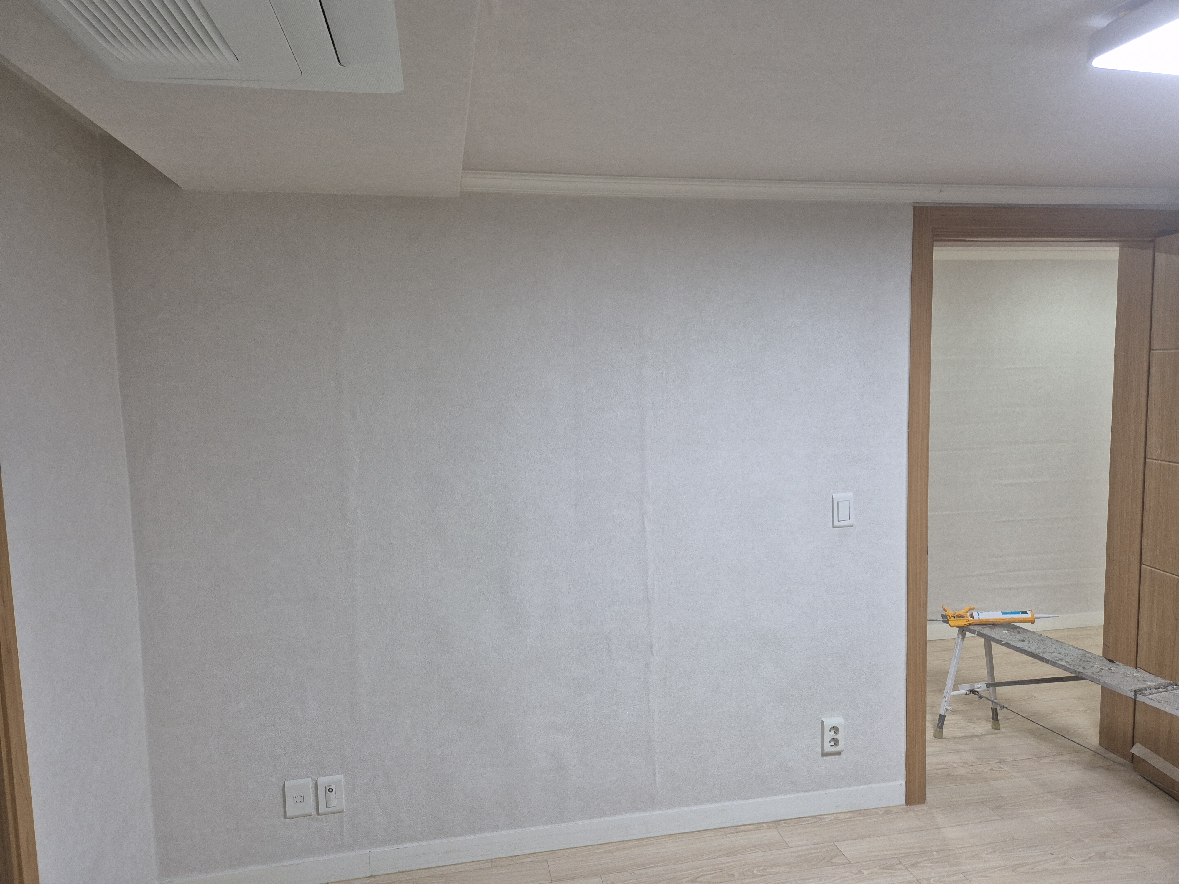 목공 작업의 흔적을 지우고 완벽한 면을 만드는 것은 결국 도배의 몫입니다. 이음새 하나, 타공 흔적 하나 남지 않도록 기초 초배 작업부터 겹겹이 정성을 들였습니다. 새 도배지로 화사하게 마감된 천장을 보면, 시스템에어컨의 미니멀한 디자인이 비로소 제 자리를 찾은 듯 빛이 납니다.