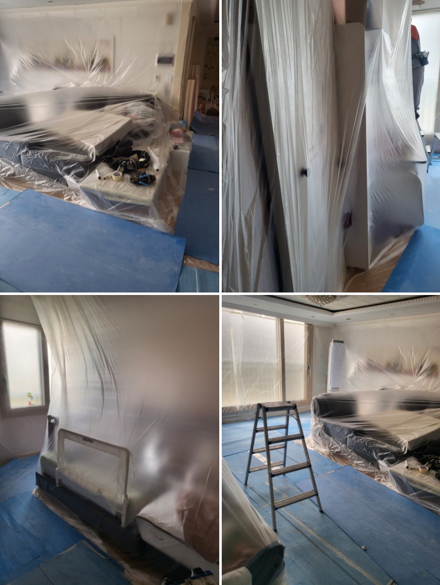 배관과 실내기가 천장 속에 매립되어 있기 때문에 타공 작업은 필수이며, 작업 중 발생하는 분진과 먼지로부터 생활공간, 가구, 가전제품 등을 보호하기 위해 꼼꼼한 보양 작업을 했습니다.